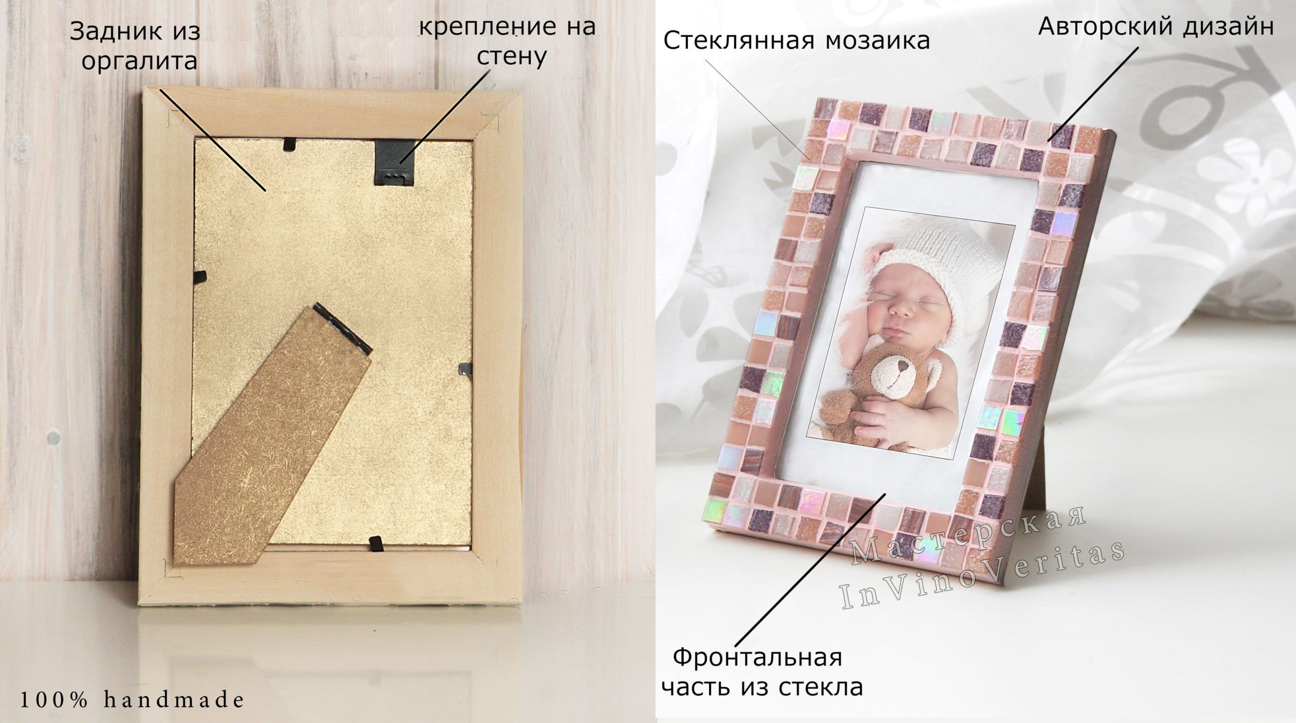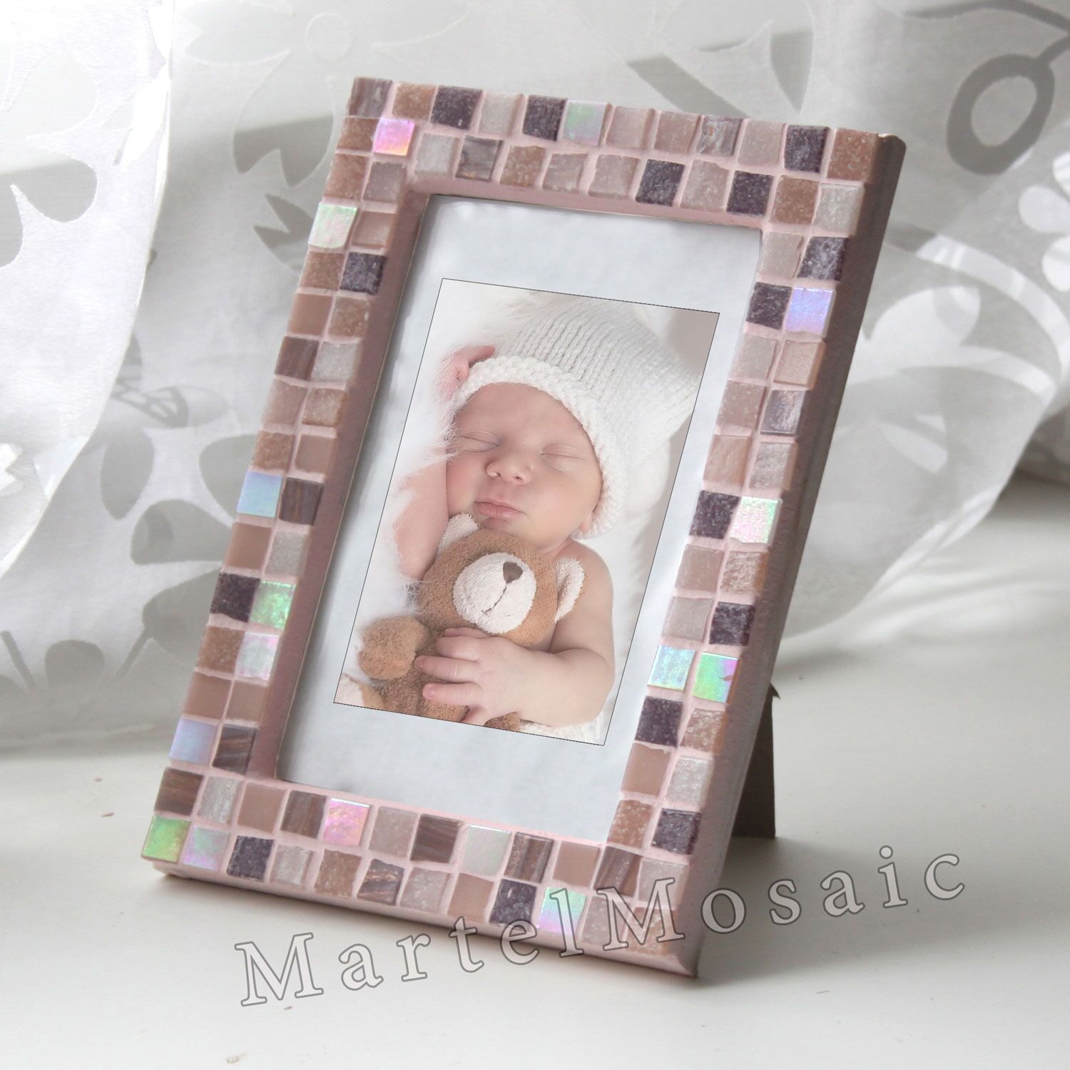 Фоторамка для новорожденной девочки. Фоторамка приятных спокойных оттенком подойдет в подарок на рождение девочки. Рамка ручной работы, выполненной из стеклянной мозаики разных оттенков розового цвета, есть перламутровые кусочки, которые создают эффект свечения. Есть голубой вариант цвета для мальчика. Размеры фотографии: 10×15, 13х18, 15х21, 21х26,5, 21х30 см. Задняя часть фоторамки изготовлена из плотного оргалита, как следствие рама надежно стоит на поверхности. Есть крепление на стену. Cделано в России.