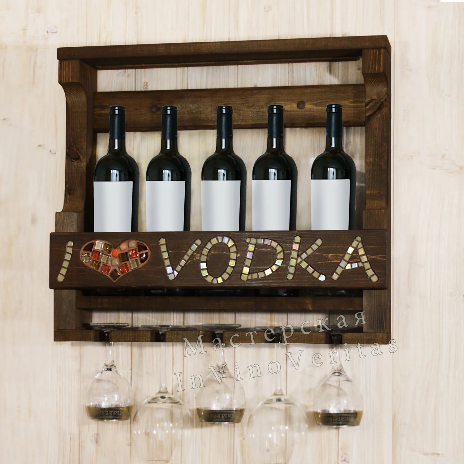Полка для алкоголя с декоративным панно «I love vodka». Панно выполнено из перламутровой мозаики бежевого цвета. Мозаика красиво играет на свету, переливается разными цветами радуги, создавая эффект свечения надписи. Сердце из мозаики сделано из кусочков разных форм, размеров и текстур. Цвета тоже разные: коричневый, красный, кремовый, бордовый.