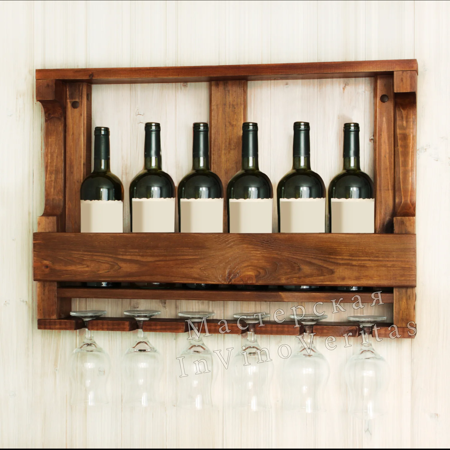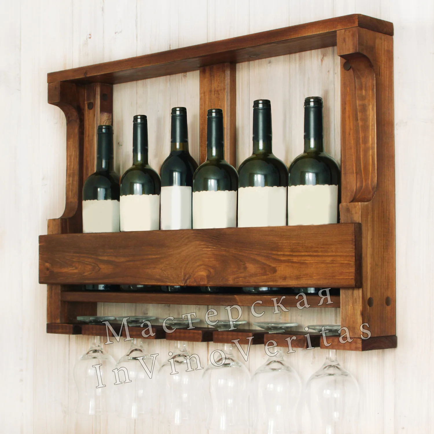 Полка винная для дома Стиль «Лофт” — классическая полка на 6 бутылок и 6 бокалов. Ручная работа!